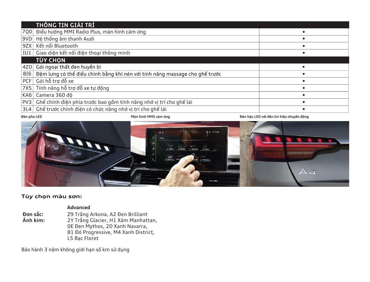 Tại thị trường Việt Nam, Audi A4 40 TFSI Advanced Plus 2025 mang đến cho người dùng 9 tùy chọn màu sơn ngoại thất, bao gồm màu đơn sắc (Trắng Ibis, Đen Brilliant), và màu ánh kim, bao gồm: Trắng Arkona, Đen Mythos, Xanh Navarra, Đỏ Tango, Xám Terra, Bạc Floret, Xám Manhattan và 2 màu Nội thất da ghế Nâu hoặc Đen