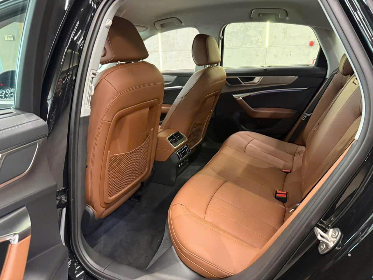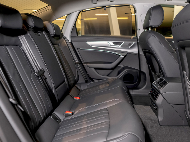Hàng ghế trước chỉnh điện, bơm lưng 4 chiều và nhớ vị trí. Hàng ghế sau trên Audi A6 2025 có đầy đủ 3 tựa đầu, trong đó ghế trung tâm có thể tùy chỉnh thành bệ để tay với hộc cố định cốc nước. Với chiều dài trục cơ sở 2.932 mm, có thể thấy, không gian tại đây khá rộng rãi cho cả những hành khách cao 1m8.