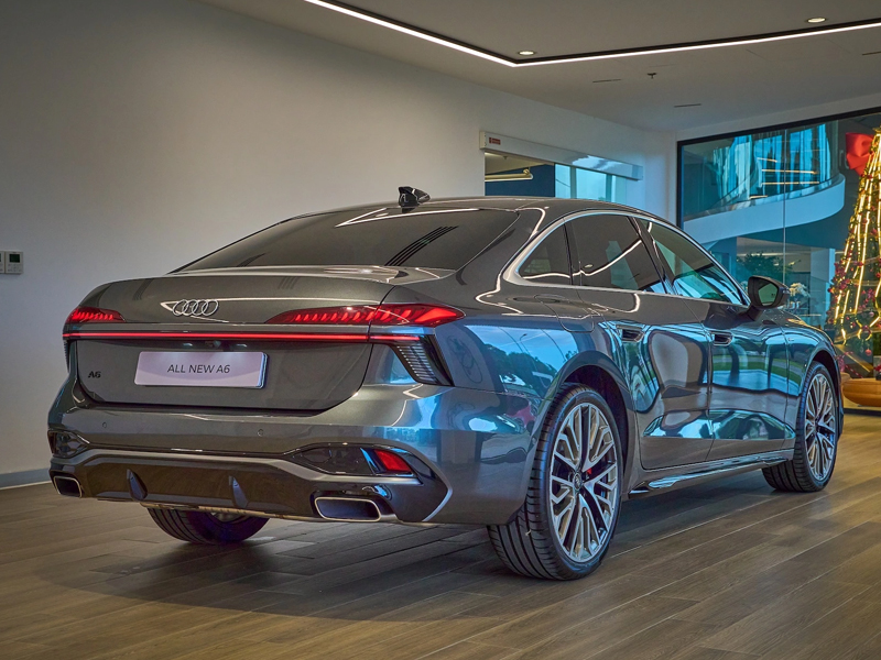 Thiết kế đuôi xe của Audi A6 S line 2.0 TFSI mang đậm phong cách thể thao với cặp ống xả hình chữ nhật bố trí đối xứng, được tích hợp gọn gàng trong bộ khuếch tán sau. Cụm đèn hậu LED thiết kế liền mạch, kết nối bằng một dải trang trí mạ chrome, tạo nên diện mạo hiện đại và sang trọng cho phần đuôi xe.