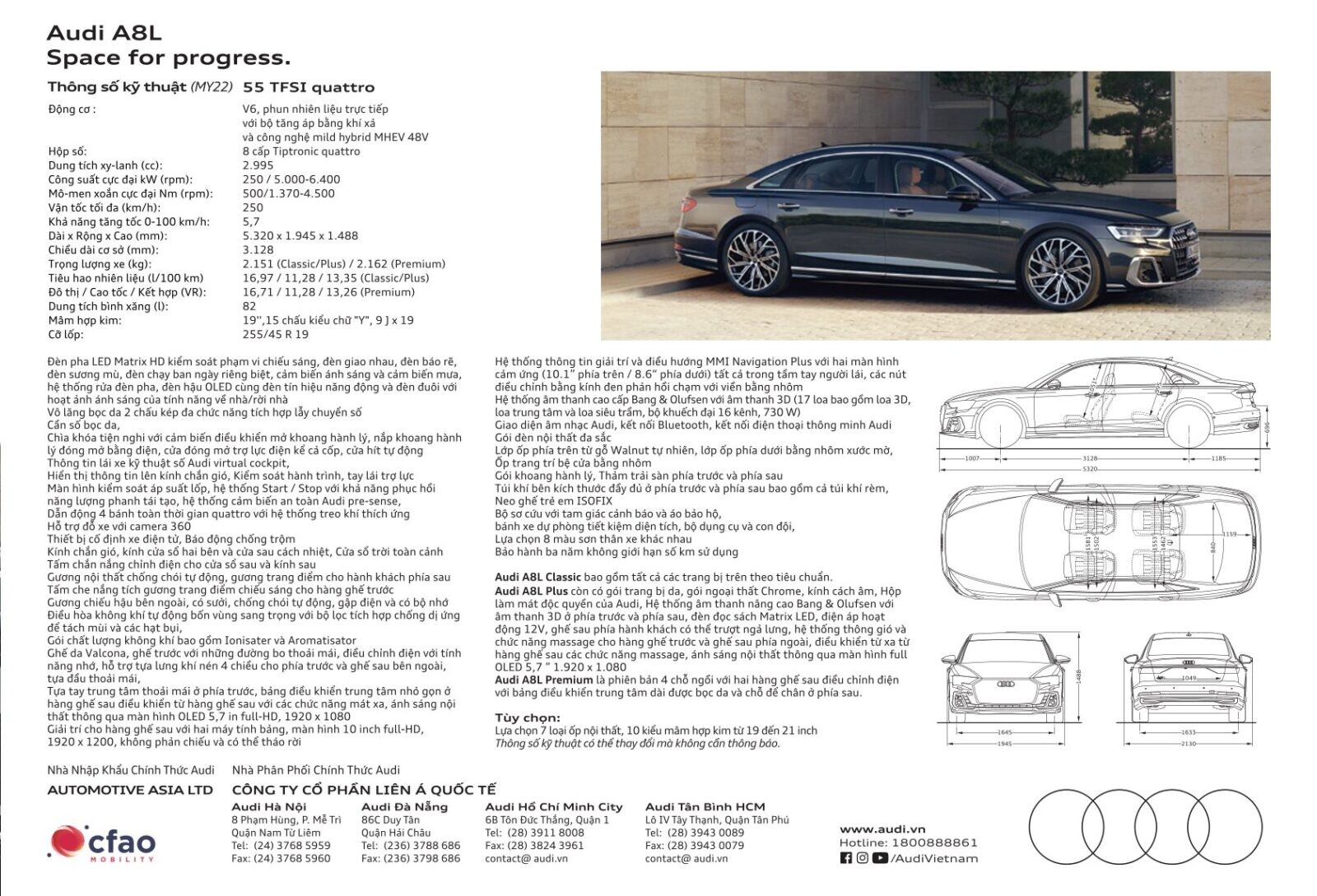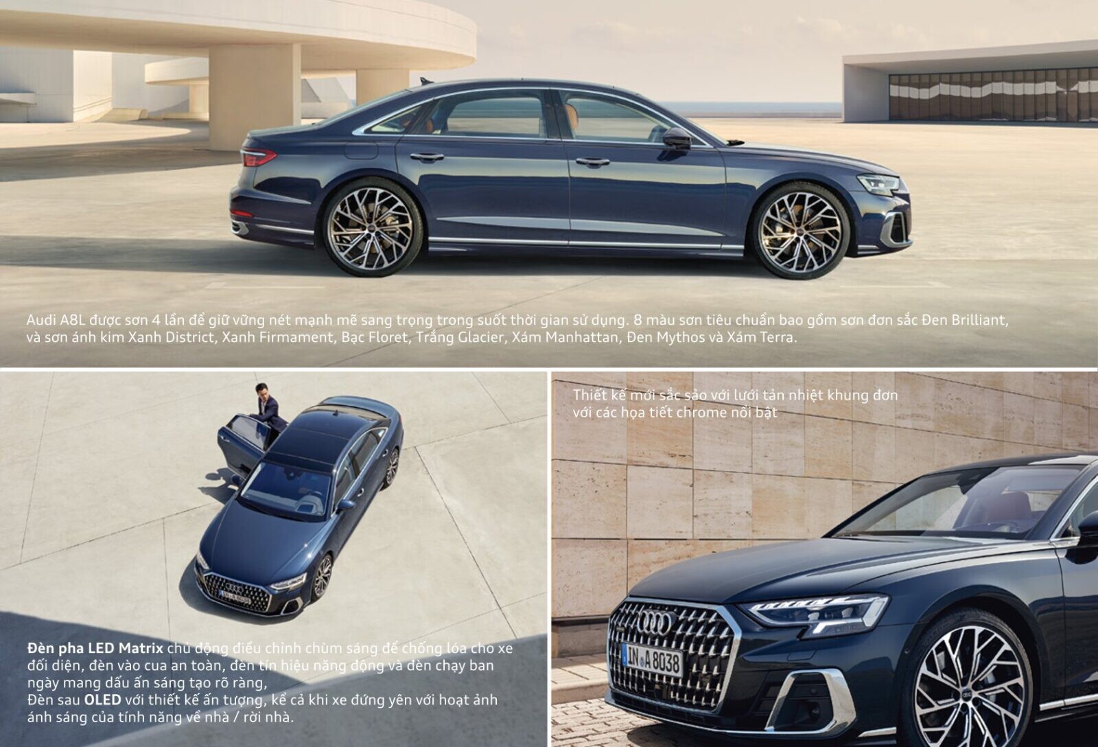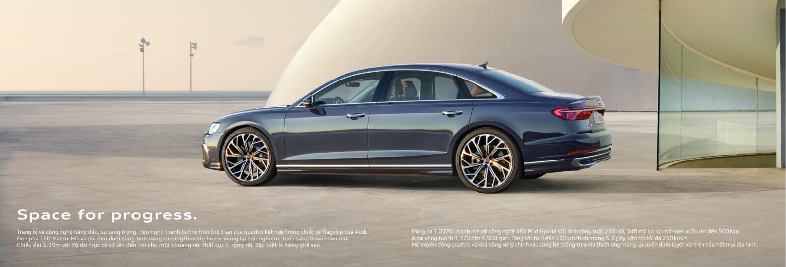 Kể từ sau những thành công vượt trội về doanh số, ngày 08/07/2022, Audi Việt Nam chính thức trình làng dòng sedan cỡ lớn với biến thể duy nhất là Audi A8L 55 TFSI quattro 2024. Qua đó, xe nhận được nhiều thay đổi từ ngoại thất, nội thất đến các tiện ích hàng đầu giúp tăng thêm sức hút trước các đối thủ sừng sỏ trong cùng phân khúc.