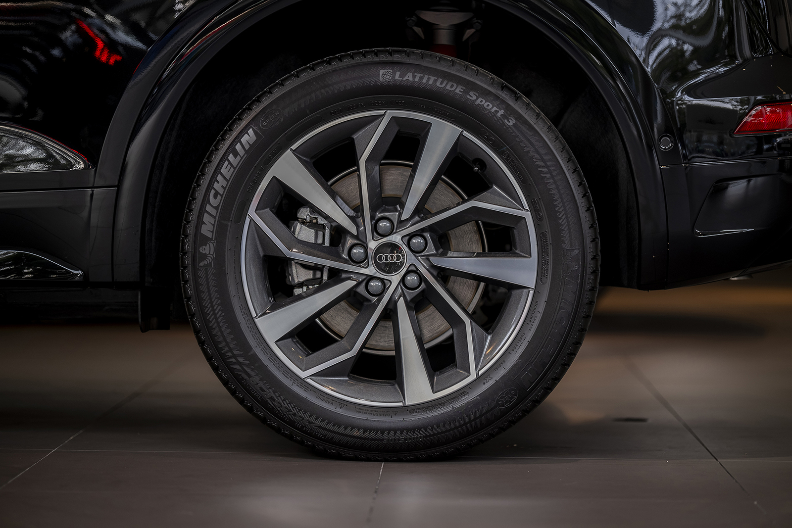 Mẫu Q5 S line được trang bị la-zăng 19 inch kiểu chữ V 5 chấu cách điệu màu xám ánh kim Graphite, cỡ lốp 235/55 R19.