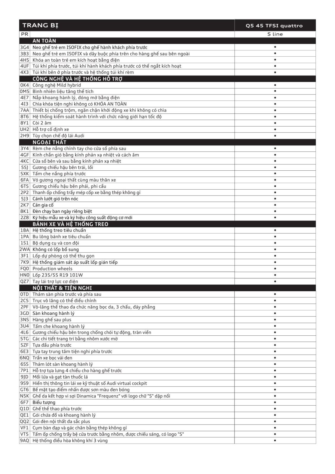 Audi Q5 2024 mới mang đến khả năng tăng tốc vô cùng ấn tượng cùng khả năng vận hành năng động, xử lý nhạy bén. Tất cả là nhờ vào động cơ tăng áp 2.0L TFSI + Mild Hybrid 12V, 4 xilanh tăng áp, cho công suất tối đa lên đến 245 mã lực, mô-men xoắn cực đại 370 Nm ngay từ tua máy 1.600 – 4.500 vòng/ phút, đi kèm hộp số tự động ly hợp kép S-tronic 7 cấp và hệ dẫn động bốn bánh toàn thời gian quattro ultra.