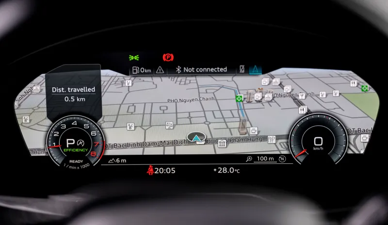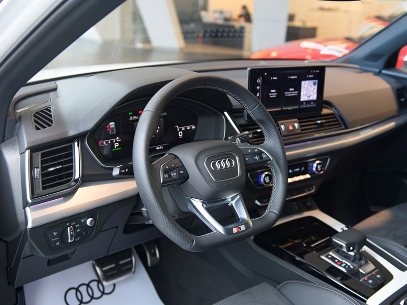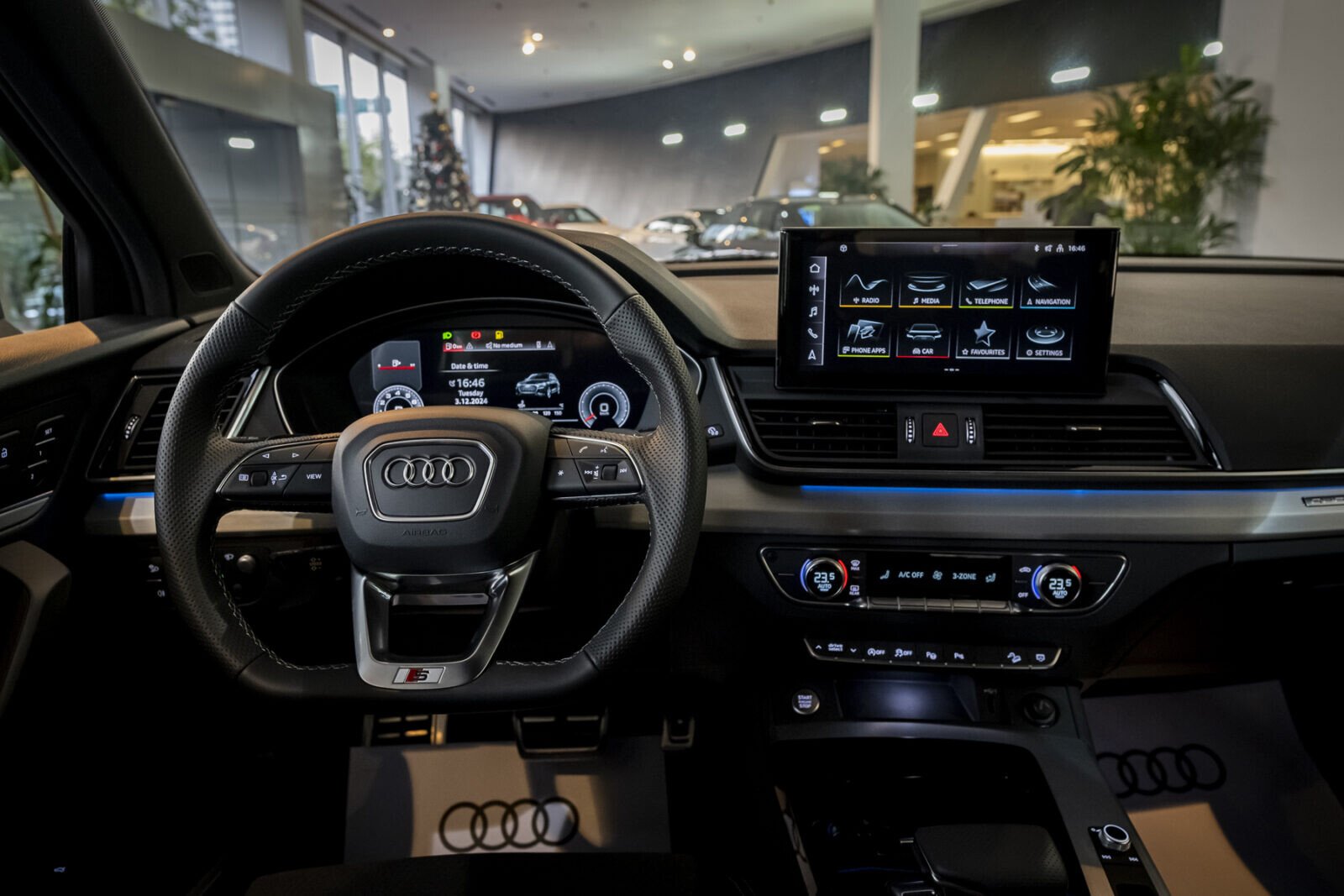 Vô-lăng của Audi Q5 45 S line được thiết kế dạng D-cut thể thao, bọc da mềm mại, tích hợp lẫy chuyển số cùng các phím điều khiển tiện lợi. Phía sau là màn hình kỹ thuật số Audi Virtual Cockpit 12,3 inch có độ sắc nét siêu cao kết hợp hệ thống hiển thị thông tin trên kính lái (HUD).