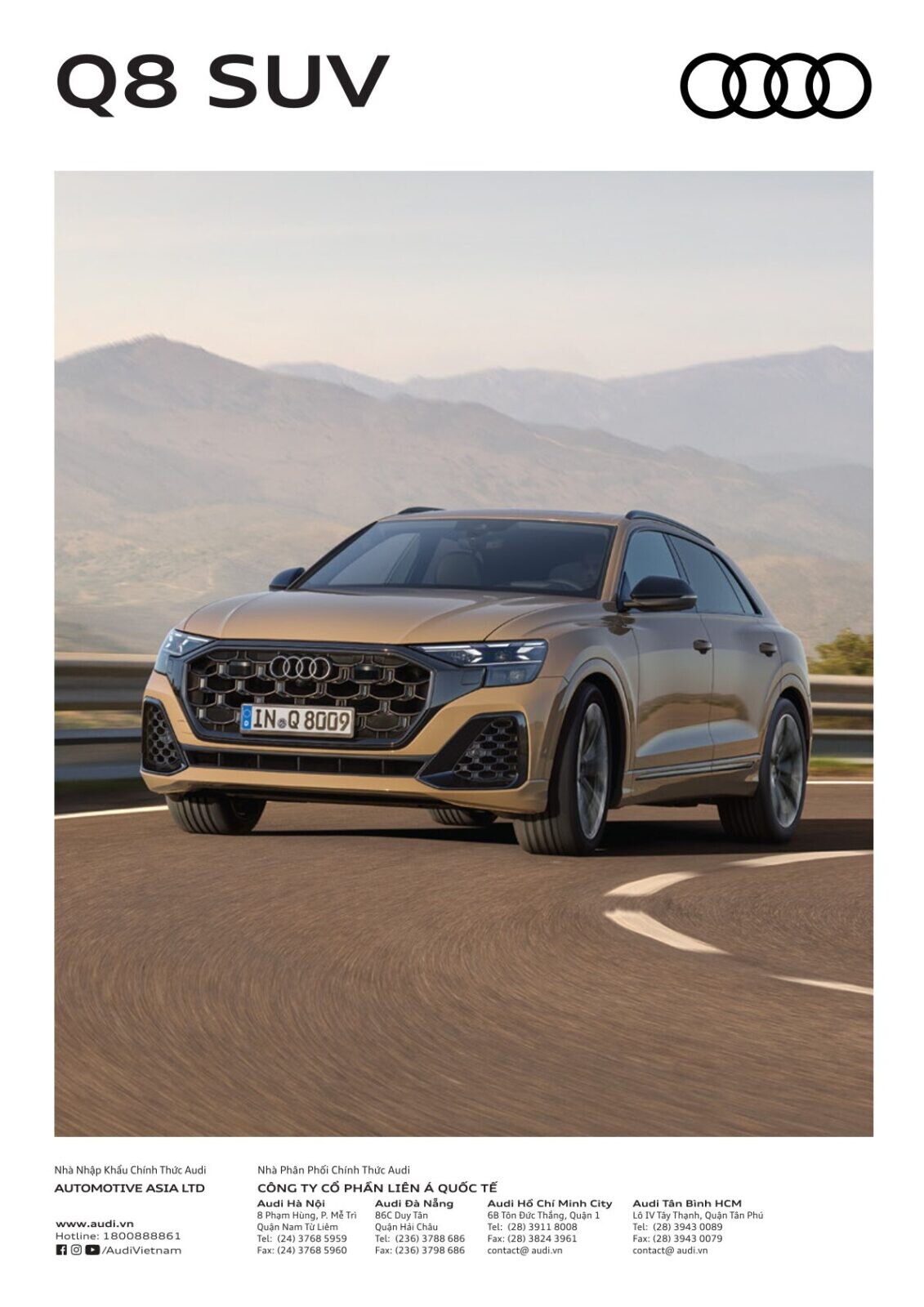 Audi Q8 ra mắt lần đầu tiên tại Triển lãm ô tô quốc tế Bắc Mỹ (NAIAS) năm 2024, tổ chức ở Detroit (Mỹ). Mẫu SUV hạng sang sẽ được giới thiệu tại Việt Nam trong sự kiện ra mắt vào tháng 9/2024, chính thức bước vào cuộc cạnh tranh với các đối thủ.