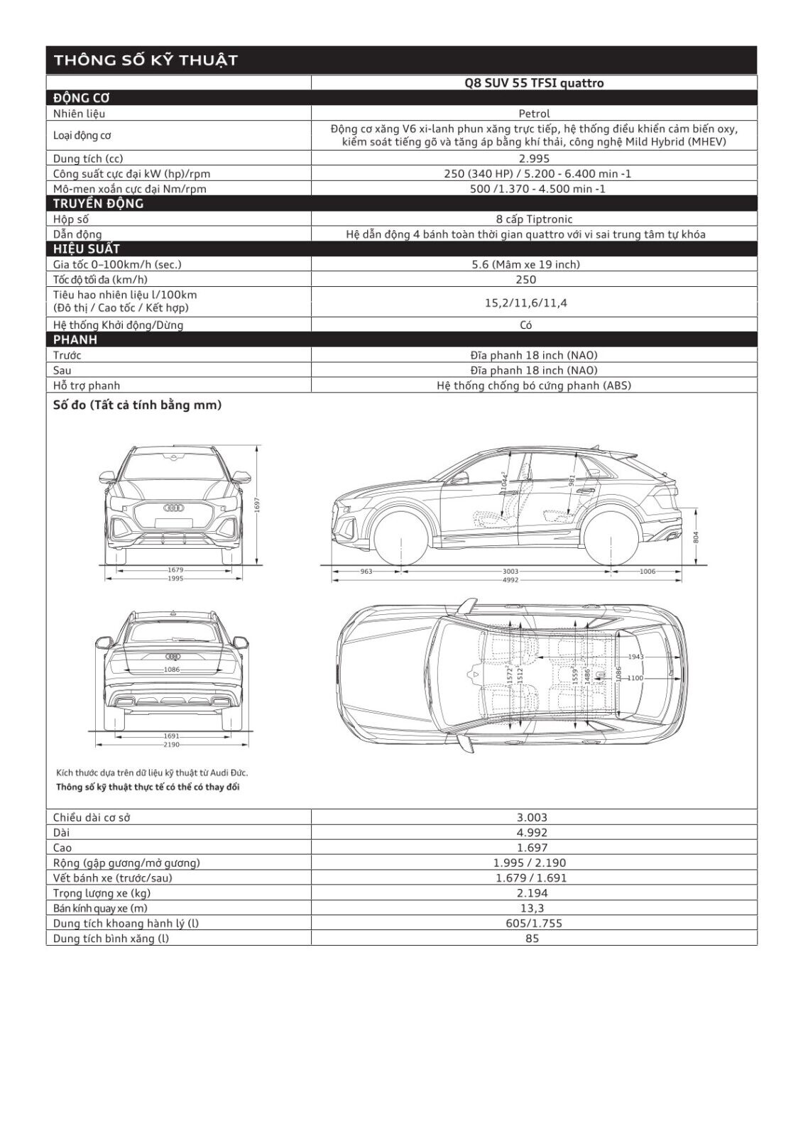 Audi Q8 2024 mang "trái tim" là khối động cơ xăng TFSI 3.0L cùng công nghệ mild hybrid MHEV 48V, sản sinh công suất tối đa 340 mã lực, mô-men xoắn cực đại đạt 500 Nm bắt đầu từ dải vòng tua rất thấp 1.370 - 4.500 vòng/phút. Xe tăng tốc nhanh chóng từ 0 - 100 km/h chỉ trong vòng 5.9 giây trước khi đạt tốc độ tối đa 250 km/h.