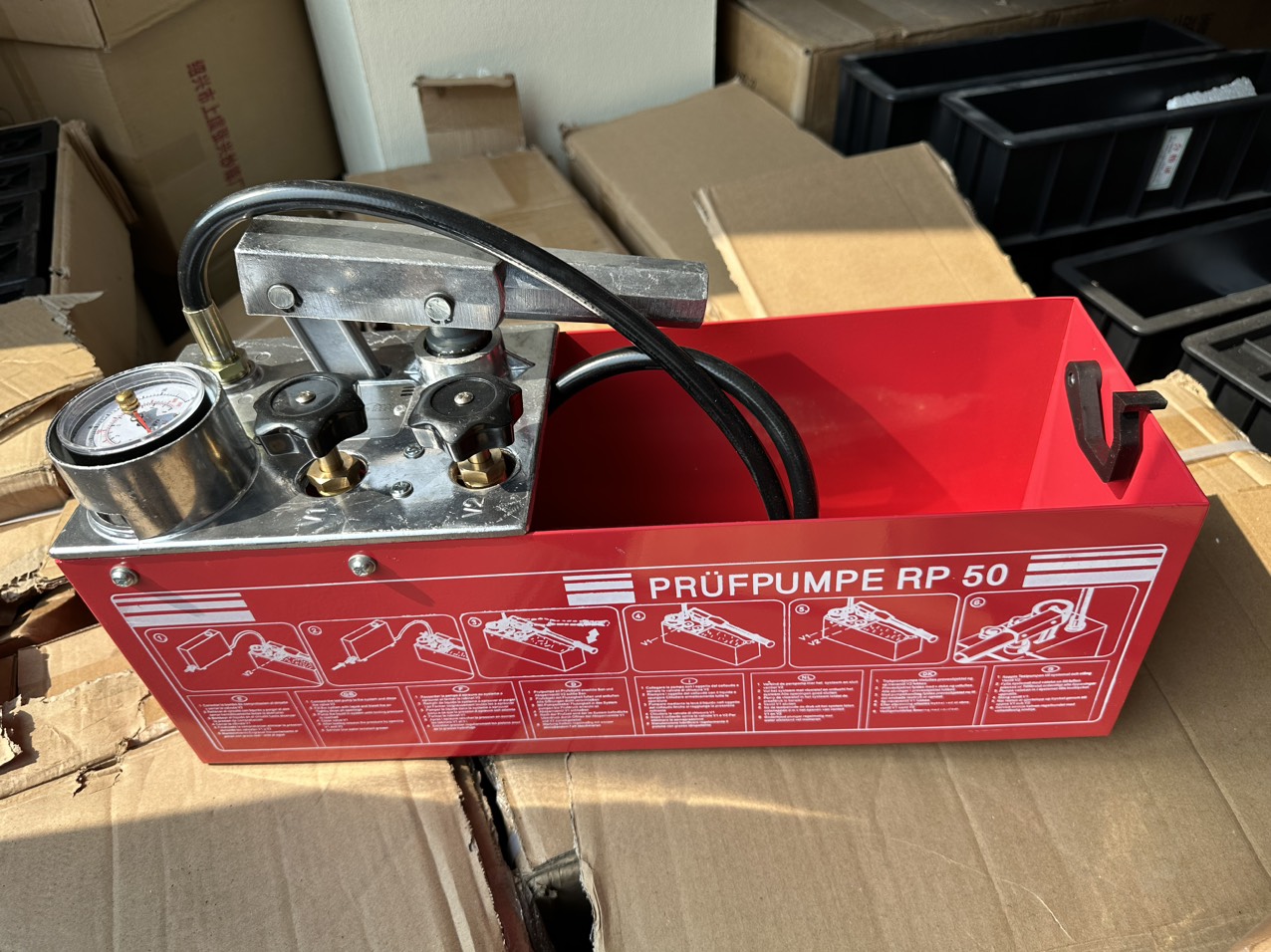 Bao gồm bơm tay, đồng hồ hiển thị áp lực tới 60 bar, thùng chứa nước, dây tuy ô đầu ra