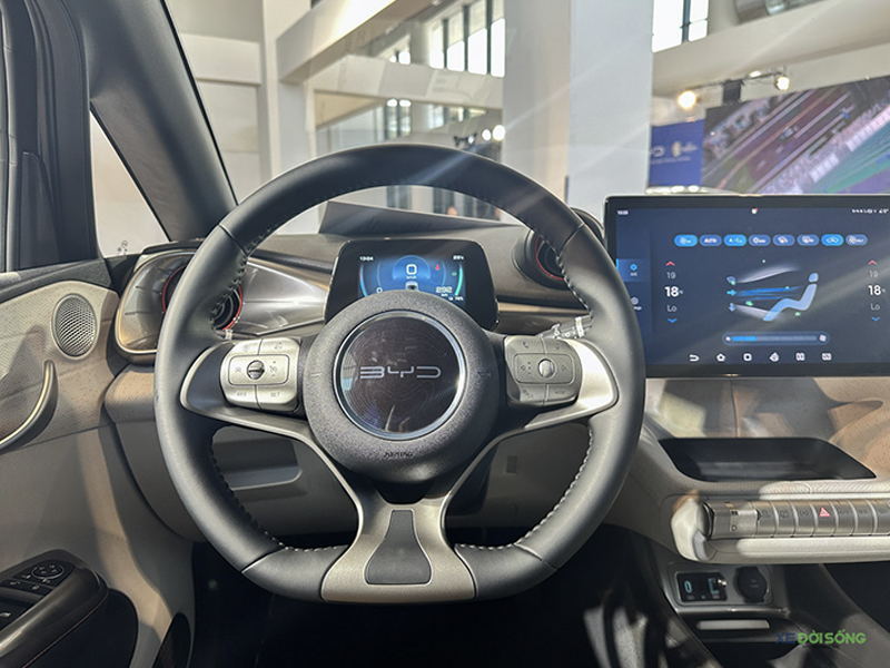 Vô-lăng của BYD Dolphin bọc da, trợ lực điện. Phía sau là màn hình tốc độ 5 inch. Xe có hỗ trợ điều khiển bằng giọng nói nhưng chỉ có tiếng Anh. Điều hòa tự động một vùng kèm bộ lọc bụi mịn.