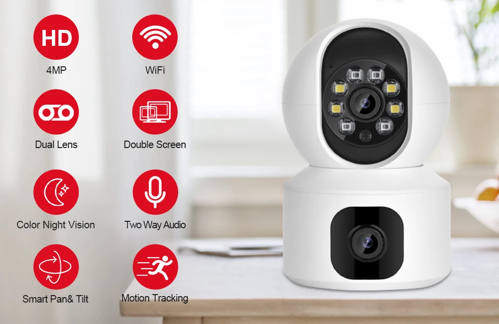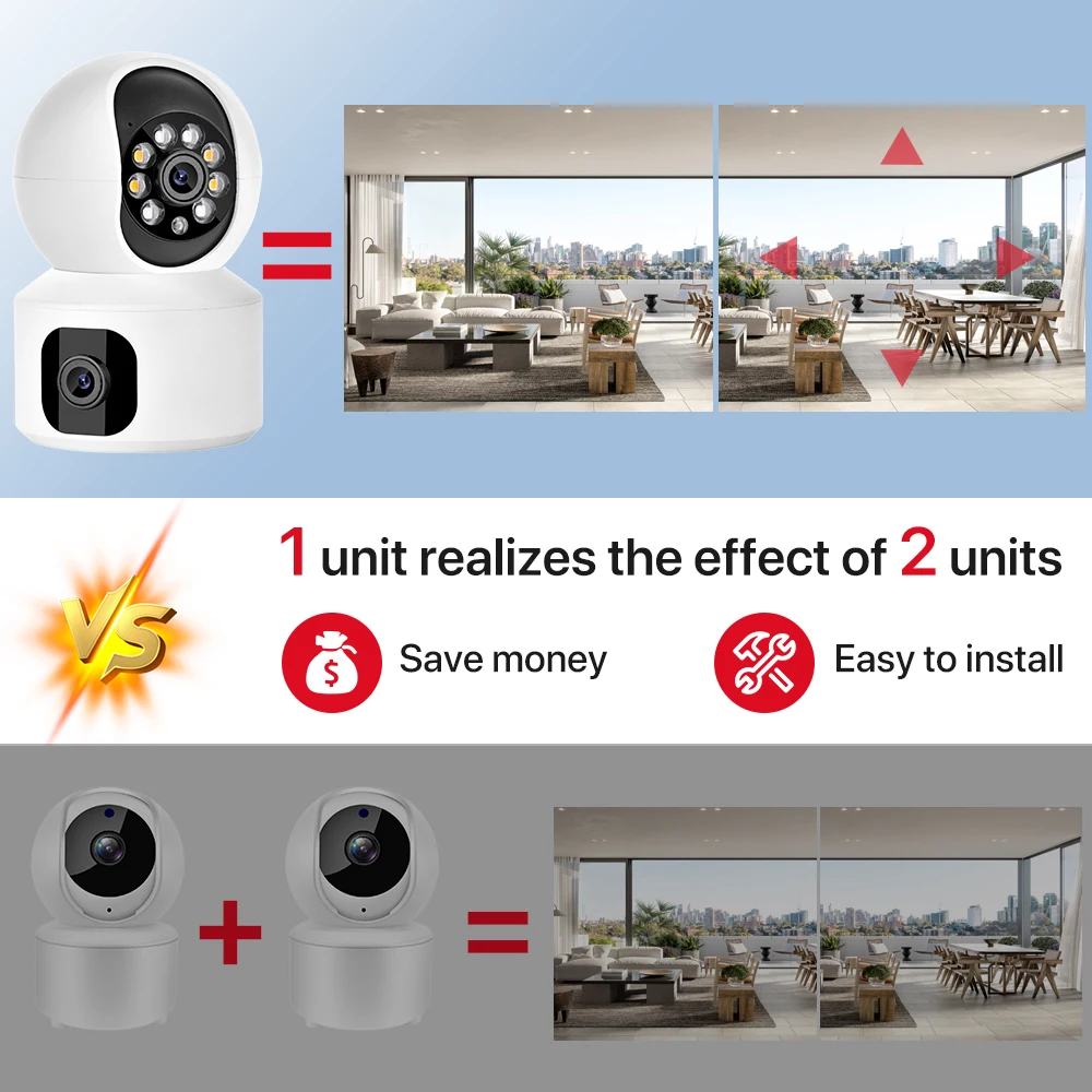 Một ống kính cố định & một ống kính điều chỉnh PTZ. Bạn có thể trượt ngón tay của bạn trên màn hình để làm cho máy ảnh xoay lên/xuống/trái/phải, theo dõi bất cứ nơi nào bạn muốn