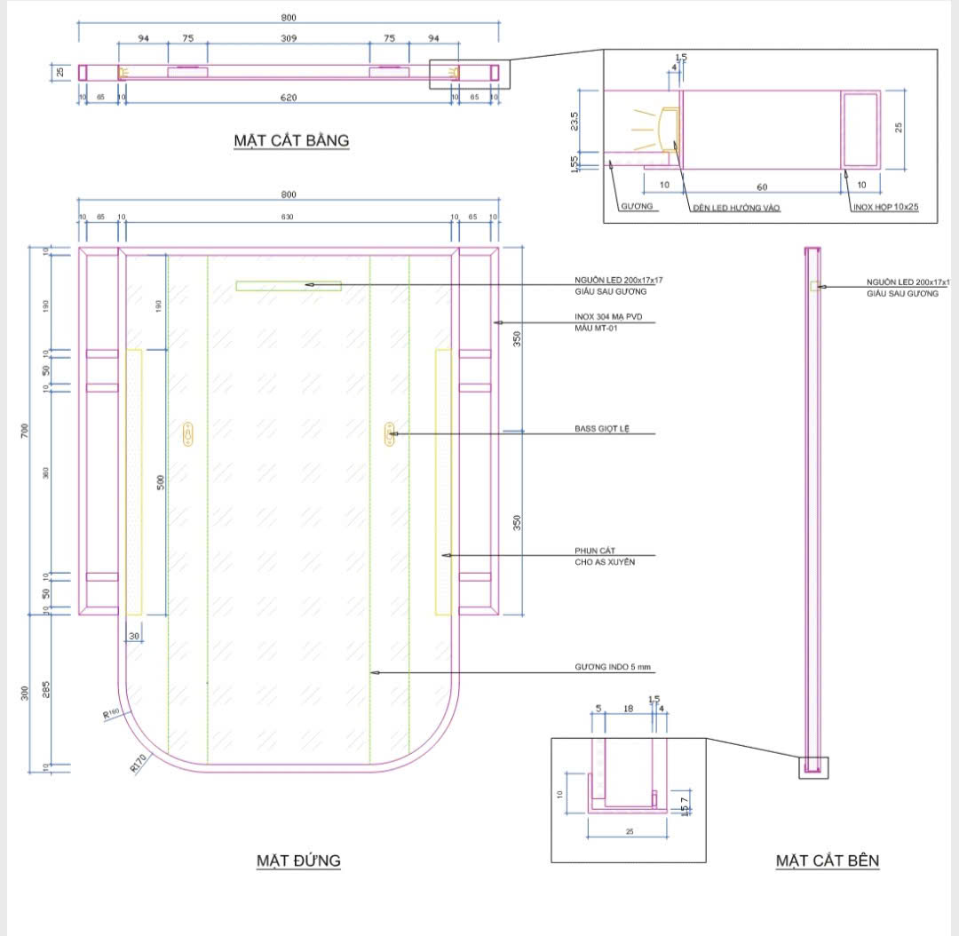 Gia công cắt kính, khung inox, lắp LED theo bản vẽ kỹ thuật.