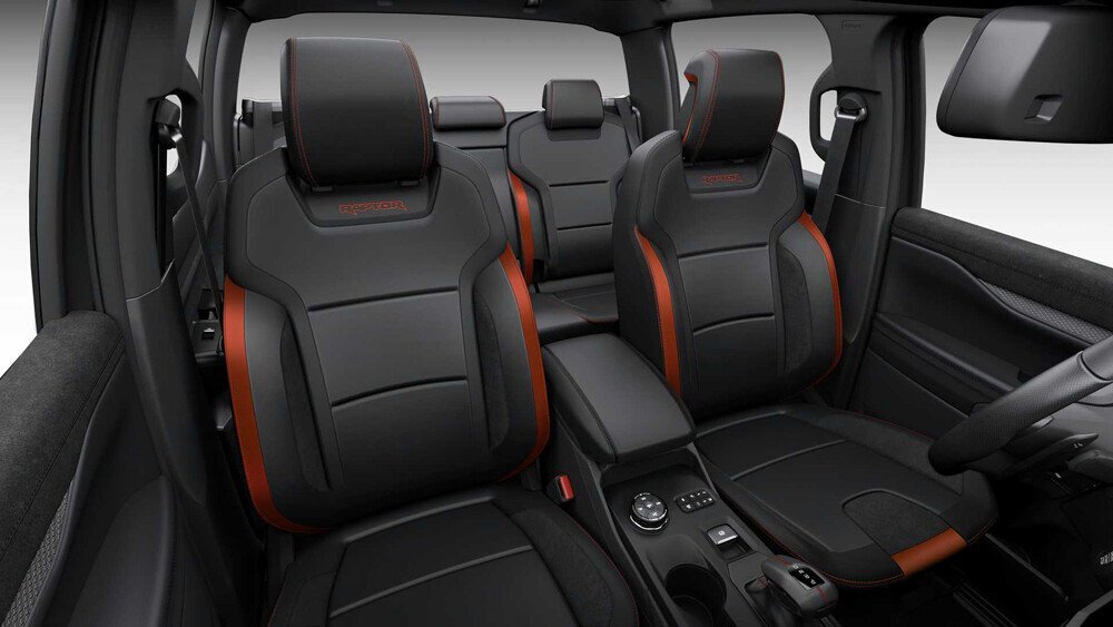 Nội thất Ford Ranger Raptor 2026 được trang bị ghế thể thao, lấy cảm hứng từ máy bay chiến đấu, chỉ khâu màu đỏ, vô lăng bọc da cao cấp, có tính năng sưởi và tích hợp lẫy chuyển số cũng như hệ thống đèn viền.