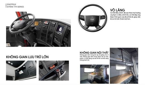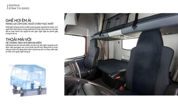 Ngoài ra đầu kéo Howo Sinotruk còn được trang bị ghế hơi chỉnh đa hướng giúp cho tài xế có được sự êm ái nhất khi ngồi lái trên những cung đường khác nhau. Bên canh đó đầu kéo Howo Sitrak TH7 còn được trang bị hai giường năm vô cùng rộng rãi giúp cho việc nghỉ ngơi của tài xế trở nên tiện nghi hơn.
