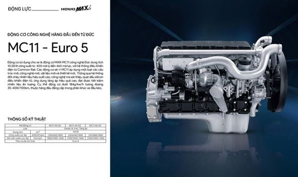 Xe Đầu kéo Howo Sinotruk T7H 440HP được trang bị động cơ MAN MC11.44-50 với công suất 440 mã lực, tự tin cung cấp sức mạnh dồi dào để vận chuyển mọi loại hàng hóa nặng trên những quãng đường dài một cách ổn định và hiệu quả. Đây là dòng động cơ diesel 4 kỳ, 6 xi-lanh thẳng hàng, tăng áp, làm mát bằng nước tiên tiến, được sản xuất bởi tập đoàn CNHTC (SINOTRUK), thừa hưởng công nghệ hàng đầu từ MAN của Đức.