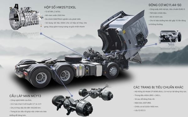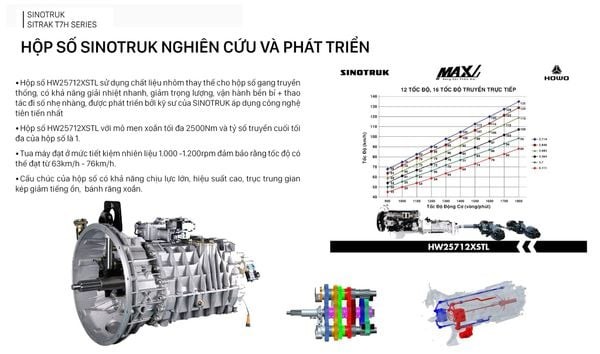 Xe Đầu kéo Howo Sinotruk T7H 440HP nổi bật với trang bị hộp số HW25712XSTL (số thường) và HW25712XSTCL (số nhanh) với 12 số tiến và 2 số lùi. Hộp số này sử dụng bánh răng nghiêng và trục trung gian kép giúp giảm tiếng ồn đáng kể và tăng cường khả năng chịu lực. Đặc biệt, hộp số được chế tạo từ nhôm cao cấp thay vì gang truyền thống. Điều này không chỉ giảm trọng lượng xe, tối ưu hóa tải trọng và tiết kiệm nhiên liệu, mà còn cải thiện khả năng tản nhiệt nhanh, nâng cao độ bền bỉ và kéo dài tuổi thọ hộp số.