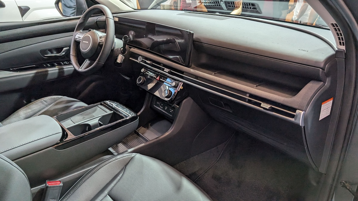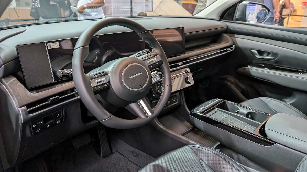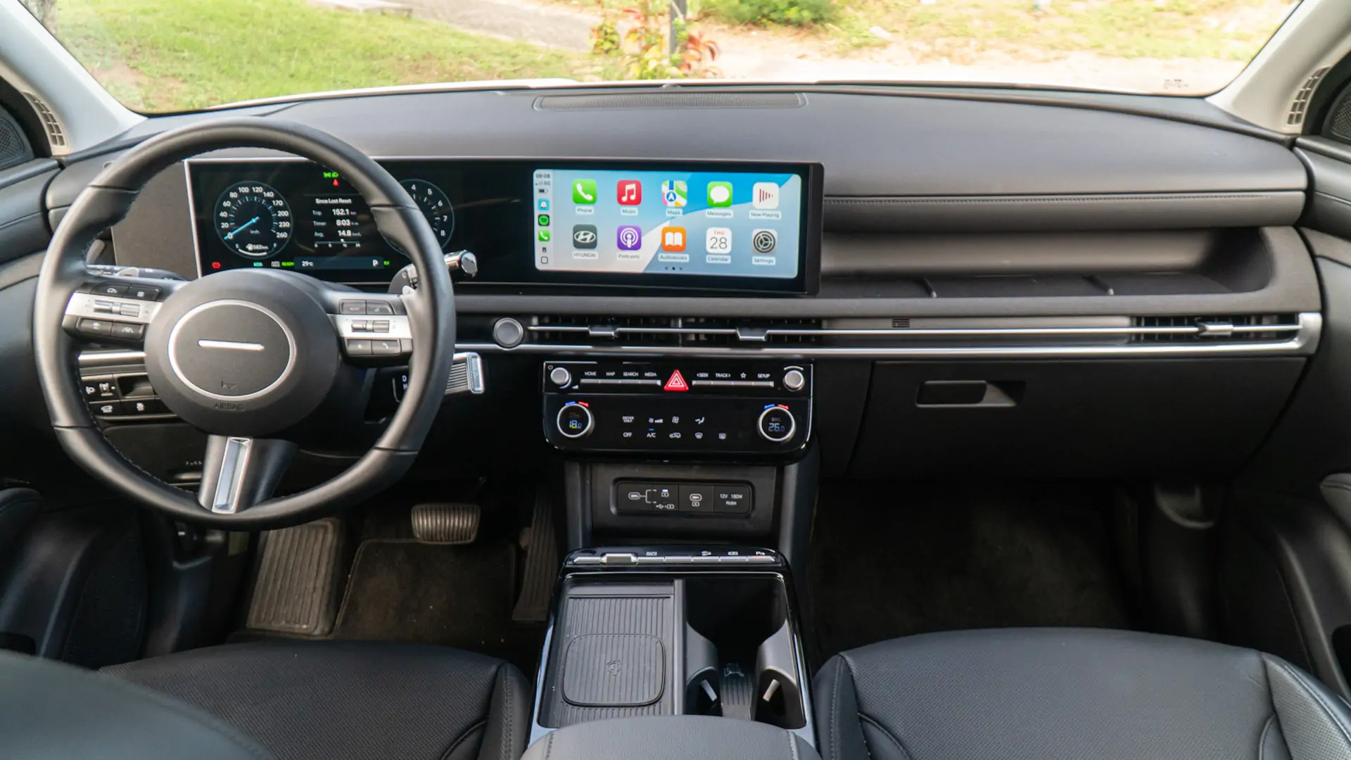 Nội thất Tucson Hybrid 2026 là điểm nâng cấp lớn nhất so với thế hệ cũ, thừa hưởng hoàn toàn phong cách từ Santa Fe mới với thiết kế ngang mở rộng, liền mạch và hướng về người lái.