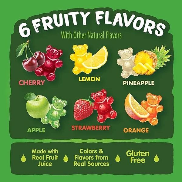 - Black Forest Organic Gummy Bears – kẹo dẻo hình chú gấu làm từ 6 vị trái cây tươi tự nhiên gồm 🍋chanh, 🍎táo, 🍓dâu, 🍒cherry, 🍊cam & 🍍trái thơm (dứa) & không chất bảo quản.