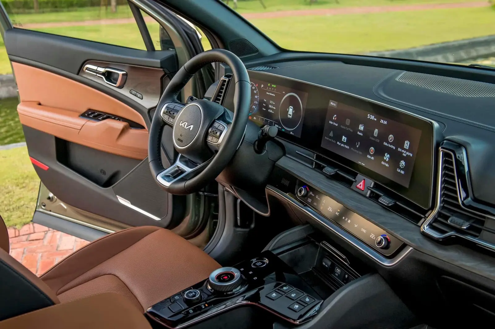 Khoang lái xe gây ấn tượng với màn hình đôi được KIA thể hiện trên các sản phẩm của mình. So với các mẫu xe đang bán ở Việt Nam, Sportage thế hệ mới sử dụng màn hình hiện đại hơn nhờ phần viền mỏng, vuốt cong.