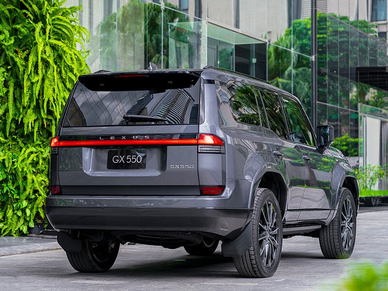 Đuôi xe Lexus GX550 được thiết kế với dải đèn hậu dạng LED kéo dài toàn bộ bề ngang cốp xe. Thiết kế phần cản sau kiêm bậc lên xuống nhô ra rõ rệt khiến cho chiếc xe trông có vẻ vững chắc hơn và mang đến sự tiện nghi trong sử dụng thực tế.