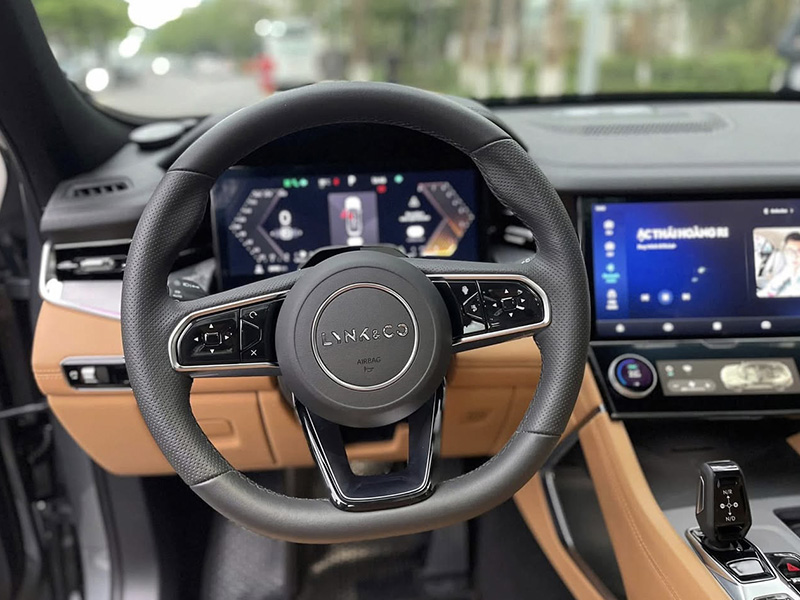 Màn hình hiện thị thông số sau vô lăng 12.3 inch sắc nét, gương chiếu hậu trong xe có tính năng chống chói. Vô lăng của Lynk & Co 09 là loại 3 chấu thể thao, được thiết kế với phong cách tối giản nhưng sang trọng, phù hợp với tổng thể nội thất cao cấp của xe.