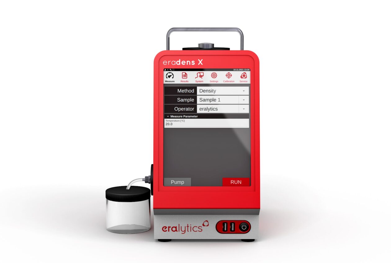 Eradens X is the world’s smallest and lightest high-precision density meter measuring in full compliance with ASTM D4052 and ISO 12185. Its revolutionary vertically aligned x-oscillating metal U-tube design is extremely reliable and insensitive to toughest ambient conditions, making the density meter eradens X the perfect solution for density testing in stationary as well as in mobile laboratories.