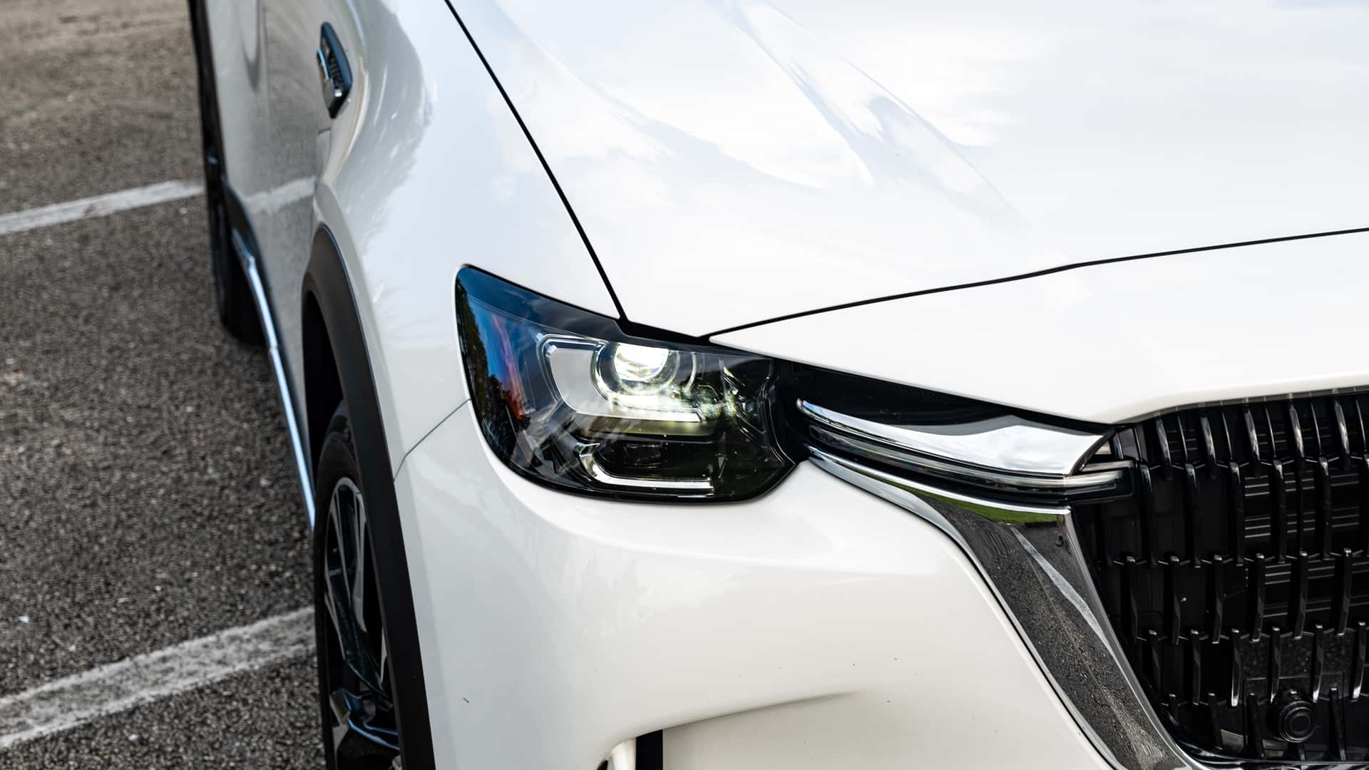 Vẫn giữ hình khối đặc trưng của ngôn ngữ Kodo nhưng được mở rộng kích thước đáng kể, tạo cảm giác bề thế và vững chãi. Thay vì dạng thanh ngang đơn điệu, Mazda sử dụng họa tiết nan dọc sơn đen bóng, mang lại chiều sâu và sự sang trọng. Viền lưới tản nhiệt bằng chrome dày bản, kéo dài và nâng đỡ cụm đèn pha.