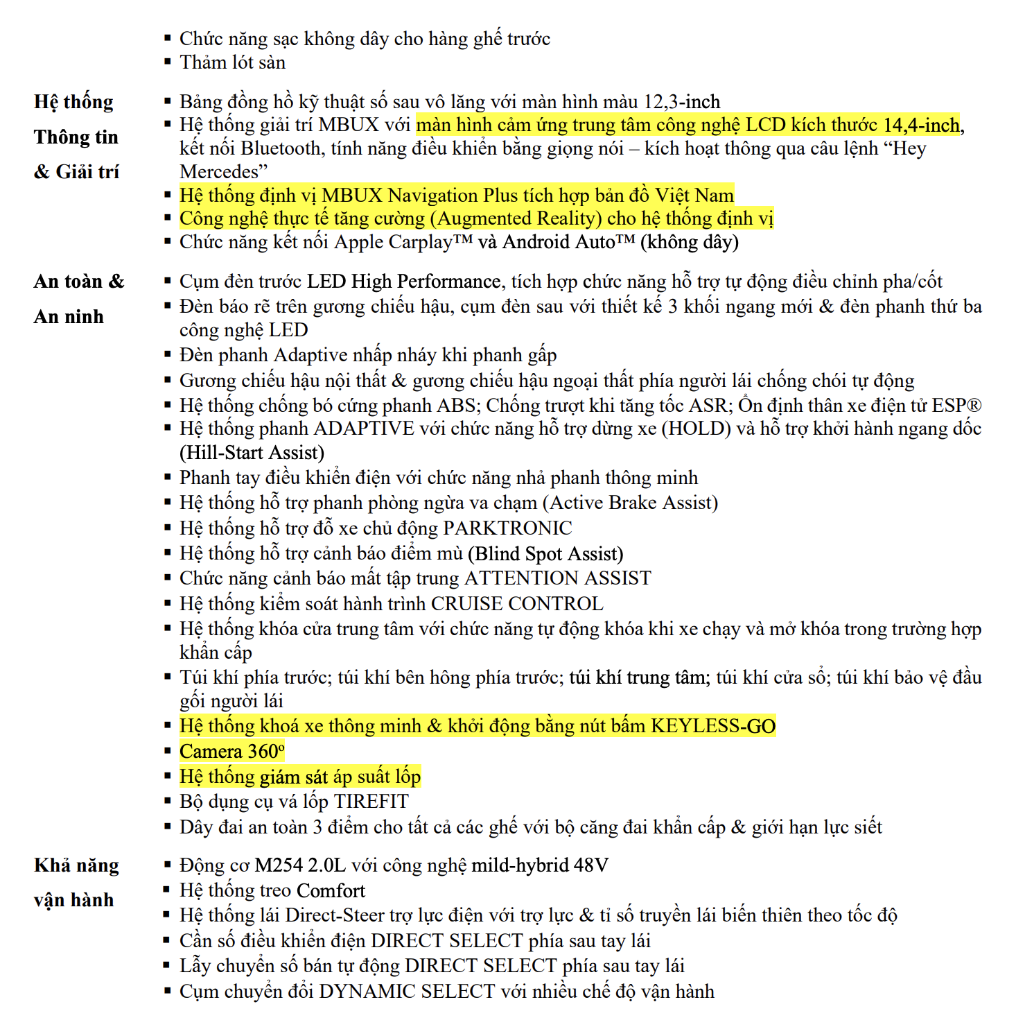 Ngoài ra, Mercedes E200 Avantgarde còn trang bị sạc không dây, touchpad cảm ứng trung tâm, chìa khóa thông minh khởi động bằng nút bấm, cùng hệ thống định vị GPS tích hợp bản đồ Việt Nam, giúp hành trình thêm tiện nghi và thuận tiện hơn bao giờ hết.