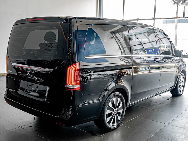 Di chuyển ra phía sau, phần đuôi xe Mercedes V250 Luxury 2025 gọn gàng và bóng bẩy với hệ thống đèn hậu dạng LED hình trụ đứng, cùng đèn phanh thứ 3 to bản đặc trưng. Cản sau kéo dài hầm hố, che khuất cặp ống xả kép bên dưới.