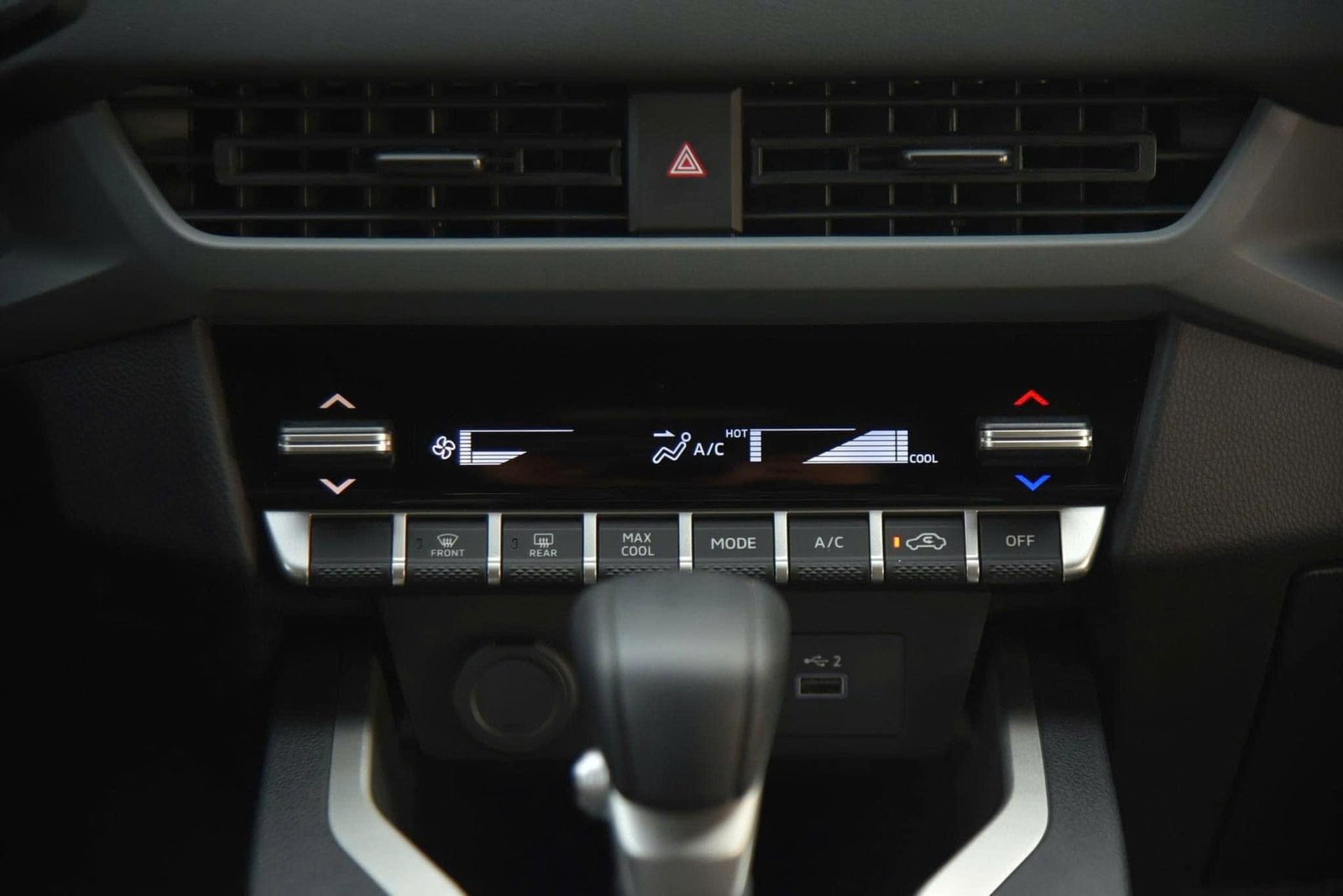 Các núm điều chỉnh điều hòa, và phía dưới là các cổng sạc. Ở hàng ghế sau cũng có ổ cắm riêng