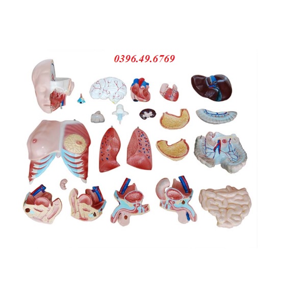 - Mô hình giải phẫu cơ thể người có nội tạng với thiết kế tháo rời 23 bộ phận cho phép sinh viên thực hành lắp ráp, từ đó tăng khả năng ghi nhớ và hiểu sâu cấu trúc giải phẫu của các hệ cơ quan như: hệ hô hấp, tuần hoàn, tiêu hóa, tiết niệu, thần kinh và sinh dục. Đặc biệt, phần cột sống và tủy sống giúp sinh viên hiểu rõ đường dẫn truyền thần kinh, rất cần thiết trong đánh giá và chăm sóc người bệnh có tổn thương thần kinh.