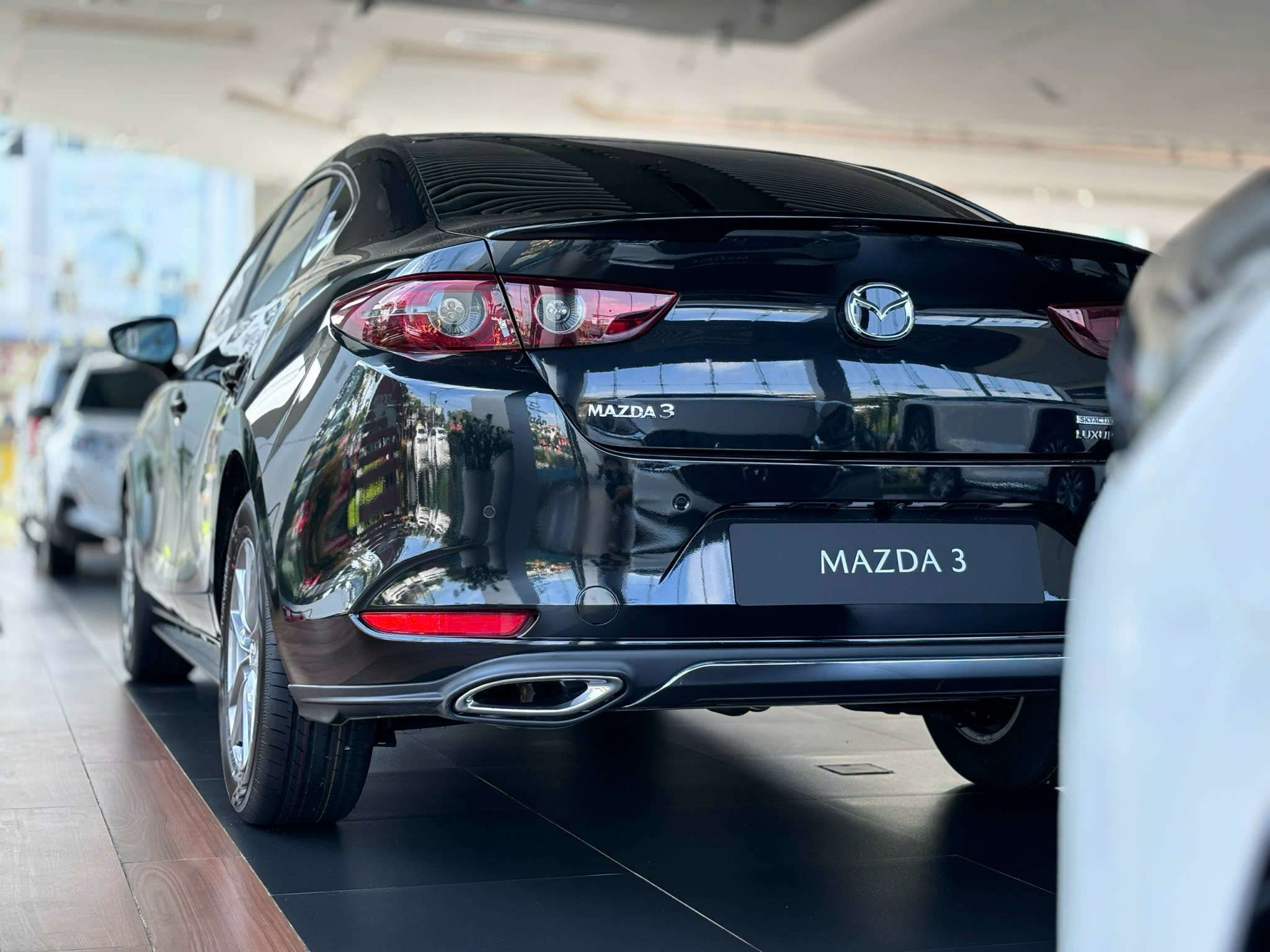 Mazda3 2025 sử dụng ống xả kép, thiết kế đuôi cốp theo phong cách vuốt lên và chờm ra khỏi mặt phẳng của cốp xe cực kỳ thể thao và cá tính. Ở bản deluxe không được trang bị ốp cản thể thao.