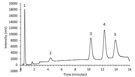 | Gradient | 5-25% B (0.0– 10.00 min) |