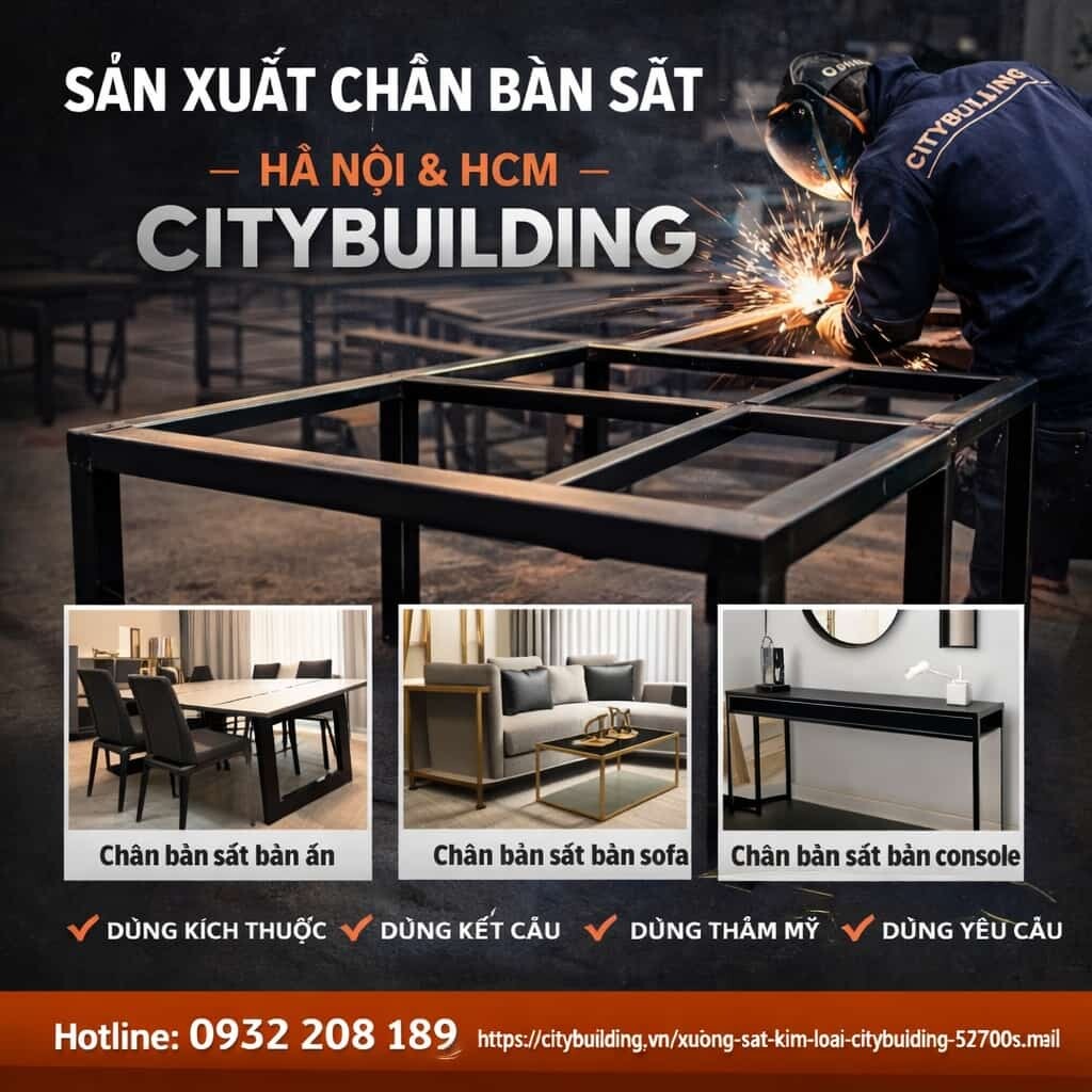 Nếu bạn đang cần tìm đơn vị sản xuất chân bàn sắt theo yêu cầu Hà Nội HCM Citybuilding để làm chân bàn ăn, bàn sofa, bàn console, bàn cafe hoặc bàn theo thiết kế riêng, hãy gửi bản vẽ hoặc kích thước thực tế để Citybuilding bóc tách và tư vấn phương án phù hợp.