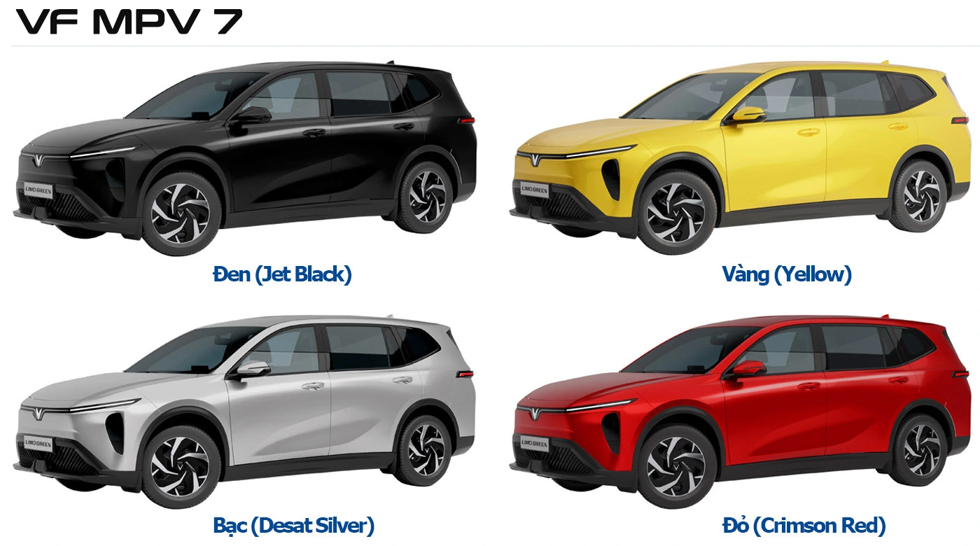 VF MPV 7 có 4 tùy chọn màu sắc ngoại thất: Vàng (Yellow) - Đỏ (Crimson Red) - Đen (Jet Black) - Bạc (Desat Silver)