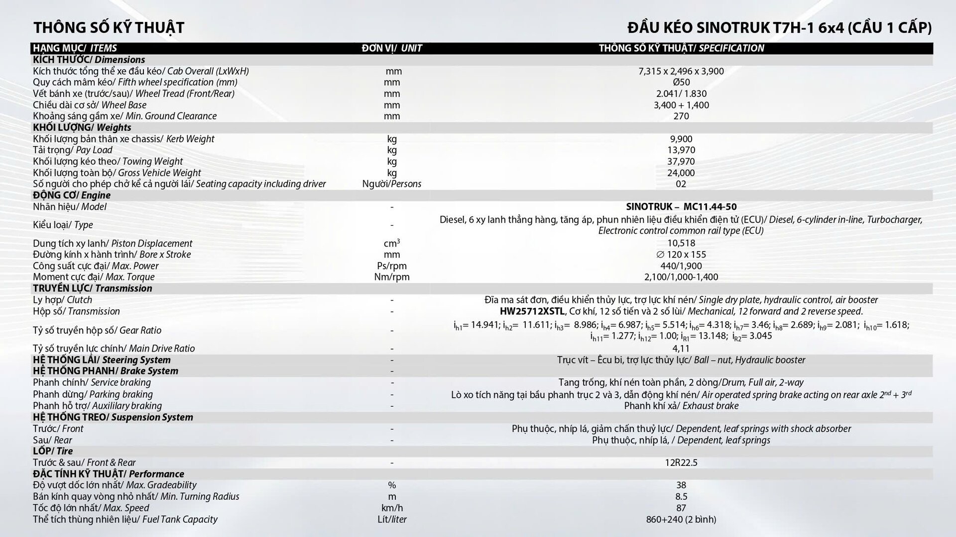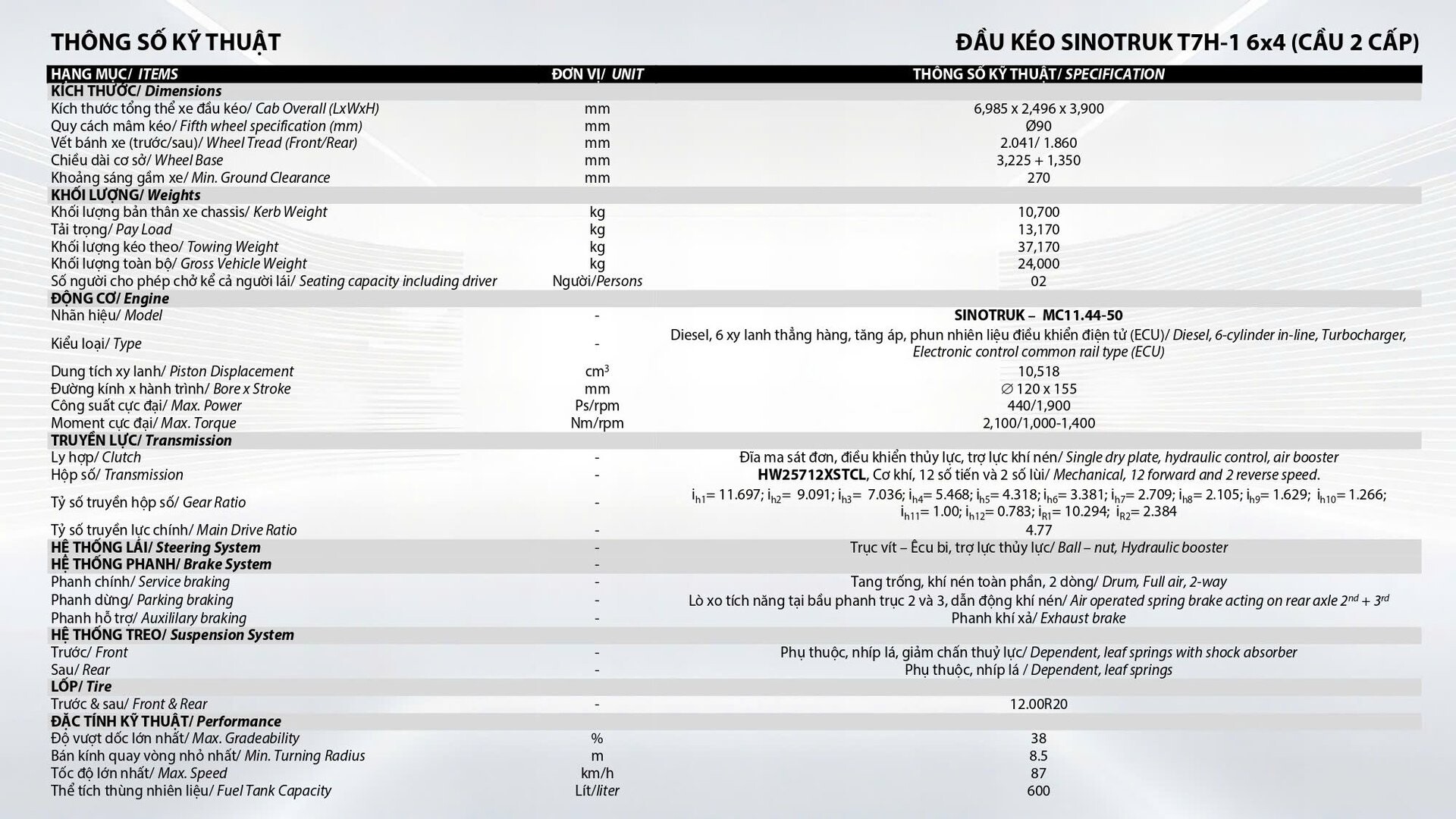 | Hộp số | SINOTRUK HW25712XSTL (12 số tiến, 02 số lùi) |