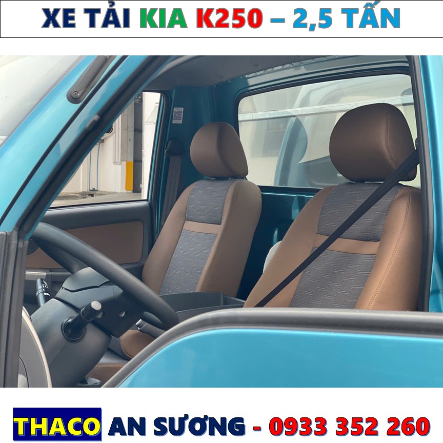 Xe tải kia K250 2,5 tấn thùng kín được thiết kế hoàn toàn mới, khoa học và ấn tượng. Gam màu xe tươi và không gian bên trong cabin rộng rãi, thoáng khí. Ghế ngồi cho 03 người có dây thắt an toàn, được bọc nỉ cao cấp giúp chống ẩm, thoáng khí và êm ái khi ngồi cả chặng đường dài. Kính chỉnh điện cùng cửa khóa trung tâm an toàn. Nội thất hiện đại và tiện nghi.