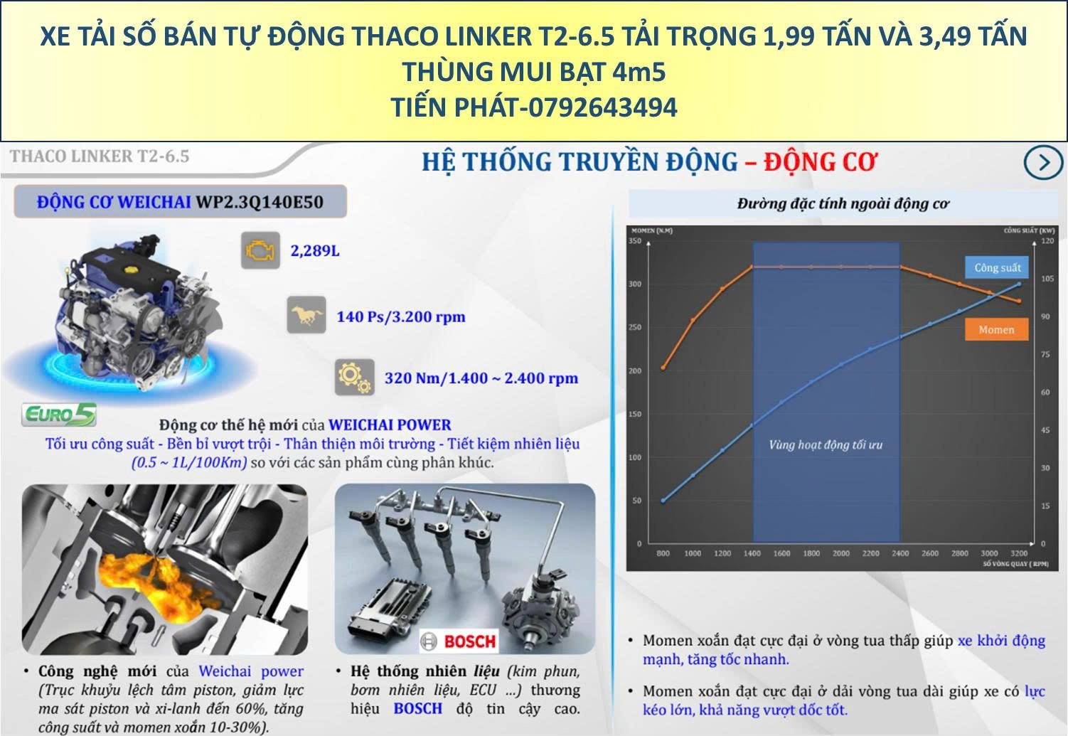 Tiếp nối thành công từ các dòng xe tải Thaco Linker, Thaco tiếp tục nghiên cứu và phát triển dòng sản phẩm Thaco Linker T2-6.5 Số Bán Tự Động hoàn toàn mới. Thaco Linker được sử dụng Động cơ Weichai công nghệ tiên tiến nhất đã sử dụng thành công trên dòng xe Thaco Bus hiện nay. Thaco Linker T2-6.5 Số Bán Tự Động được sản suất trên dây chuyền tiên tiến và hiện đại nhất Đông Nam Á tại nhà máy Thaco Chu Lai. Thaco Linker T2-6.5 Số Bán Tự Động sử dụng Động cơ Weichai với dung tích xi lanh 2,289 cc cho ra công suất cực đại 140Ps, vận hành mạnh mẽ, tiết kiệm nhiên liệu.